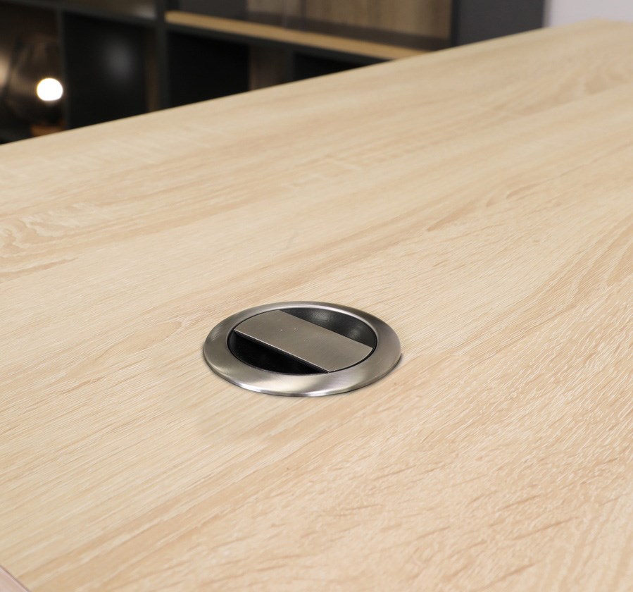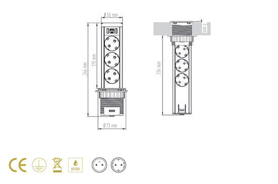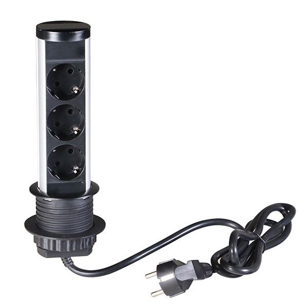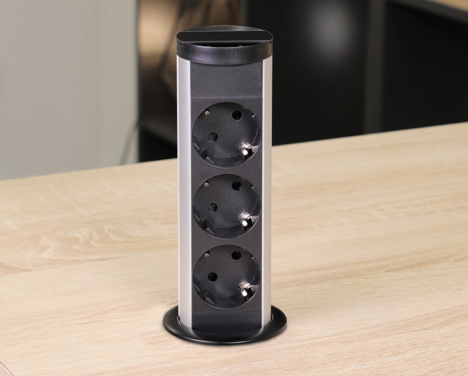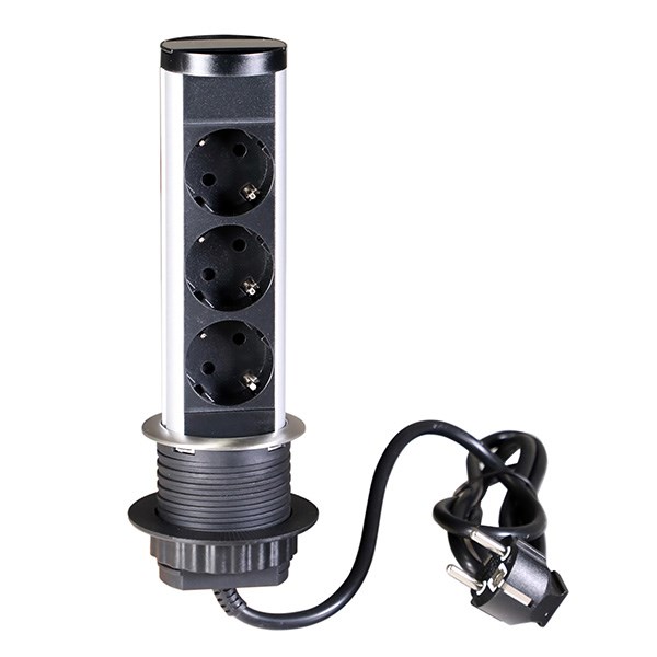 Brick-pistorasia on tasoon upotettava, vetämällä nouseva pistorasiayksikkö kolmella pistokkeella.